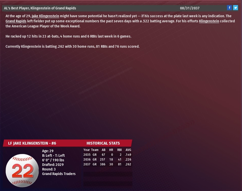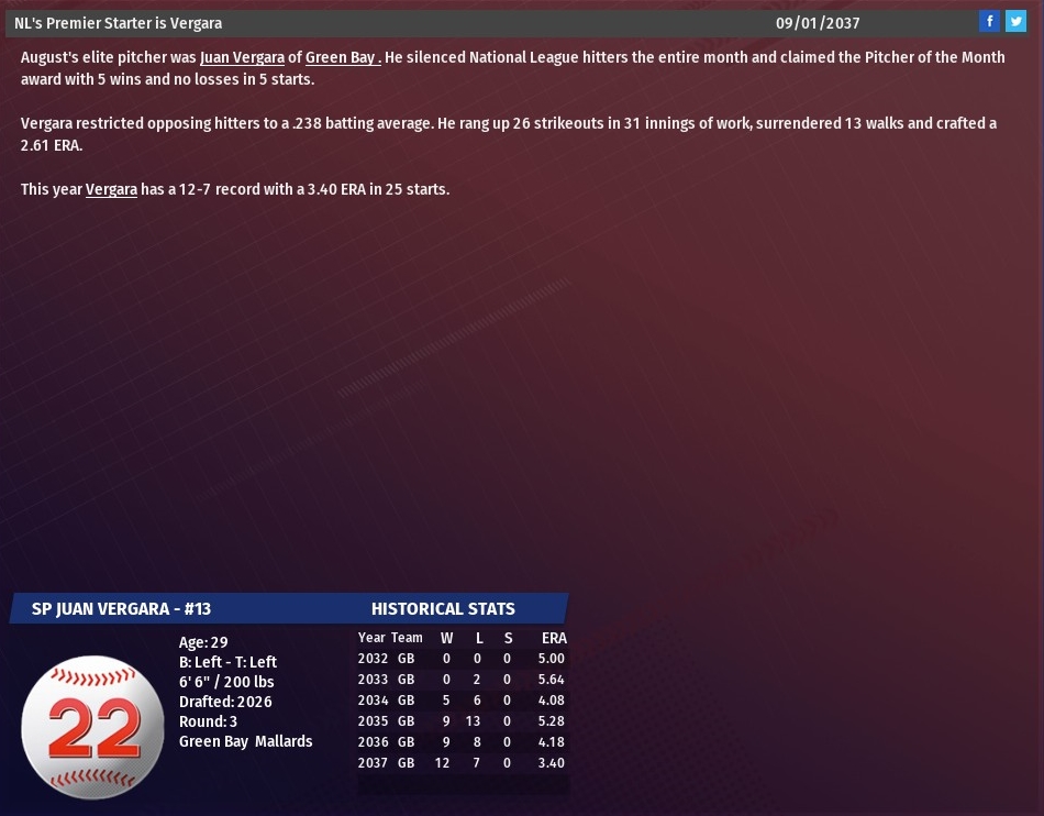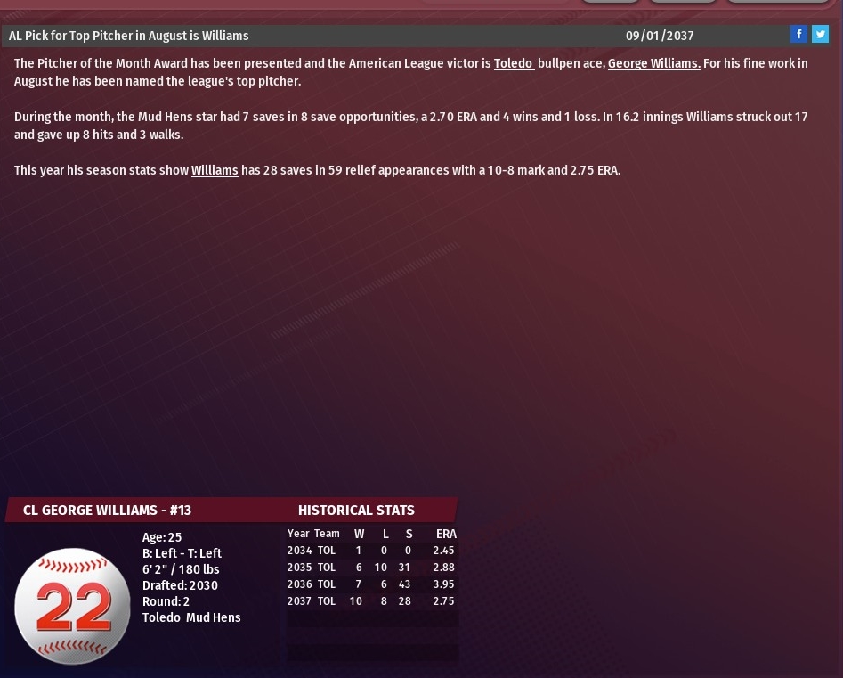 Both pitchers started the season in the majors, Hrdlicka in the starting rotation and Cox in the bullpen. Hrdlicka, 25, won his first five decisions before he began to struggle. The right-hander was sent to AAA Memphis after taking the loss in a 6-4 setback against Memphis on July 28. In 17 starts with the Walkers, Hrdlicka went 5-6 with a 4.87 ERA. At AAA, Hrdlicka wasn't great, going 4-2 with a 4.44 ERA in 10 starts, but good enough to warrant a spot on the major league roster in September. Hrdlicka could be used as a starter or reliever during the final four games of the season. Cox, 25, has been on the Walkers' major league roster since the start of the 2035 season. But something went wrong around mid-season resulting Cox being sent to AAA on August 21, following a 6-4 loss to Dayton. In 45 games with St. Louis this season, Cox has gone 4-1 with one save and owned a 4.03 ERA. During his brief time in Memphis, Cox got into two games and pitched five scoreless innings. |