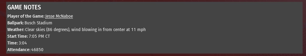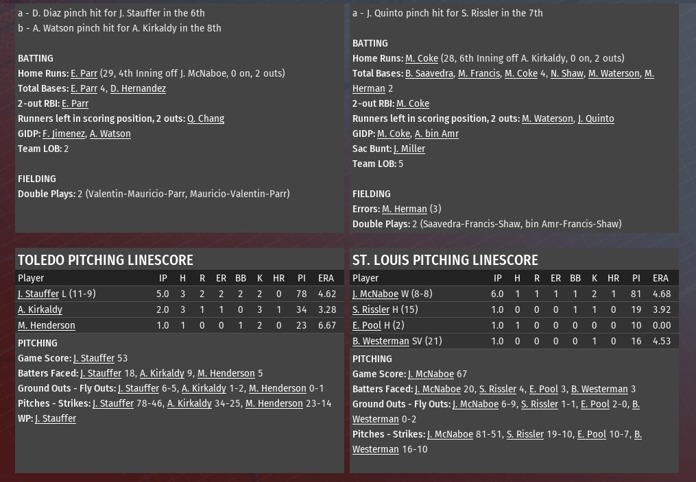 Jesse McNaboe allowed one run on one hit -- a solo homer from Ellis Parr in the fourth inning -- to help St. Louis to a 3-1 win over Toledo at Busch Stadium (2006). McNaboe (8-8) allowed just two base runners in his time on the mound, the other coming on a walk. He struck out two batters. Scott Rissler, Elvis Pool and Bobby Westerman all pitched a scoreless inning in relief. Westerman earned his 21st save. The River Walkers jumped in front in the top of the first inning against Mud Hens starting pitcher Josh Stauffer. Bob Saavedra led off the game with a walk. Marcos Francis moved him to third with a single. Saavedra scored when Manuel Coke hit into a double play. After Parr's solo homer tied it in the top of the fourth, St. Louis regained the lead in the bottom of the fifth. Mark Herman scored the run after leading off the inning with a single off Stauffer. A walk to Jackson Miller moved Herman to second. Abdul-Nasser bin Amr hit into a double play but Herman moved to third. Herman scored when Stauffer threw a wild pitch. Coke capped the scoring with a homer off Aaron Kirkaldy with two outs in the sixth. It was Coke's 28th home run of the season. He has homered in the last three games and six of the last seven. |