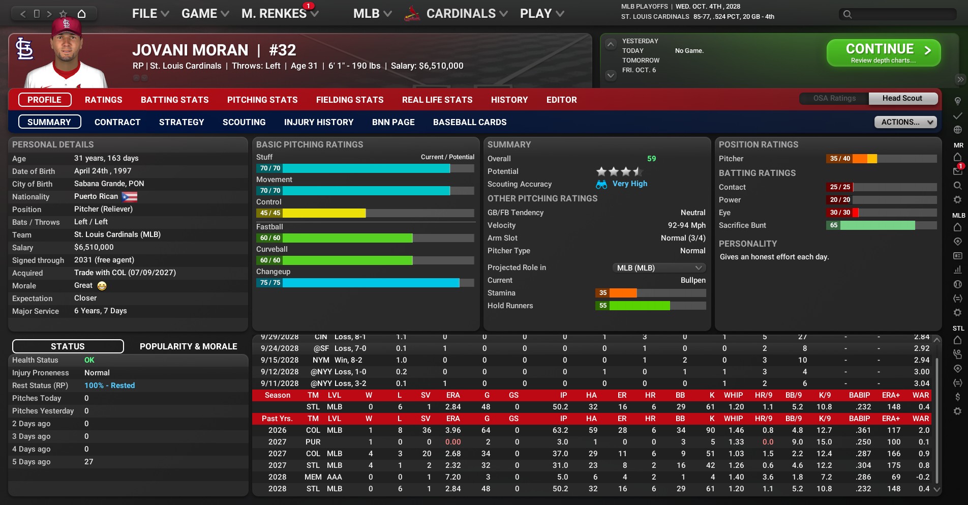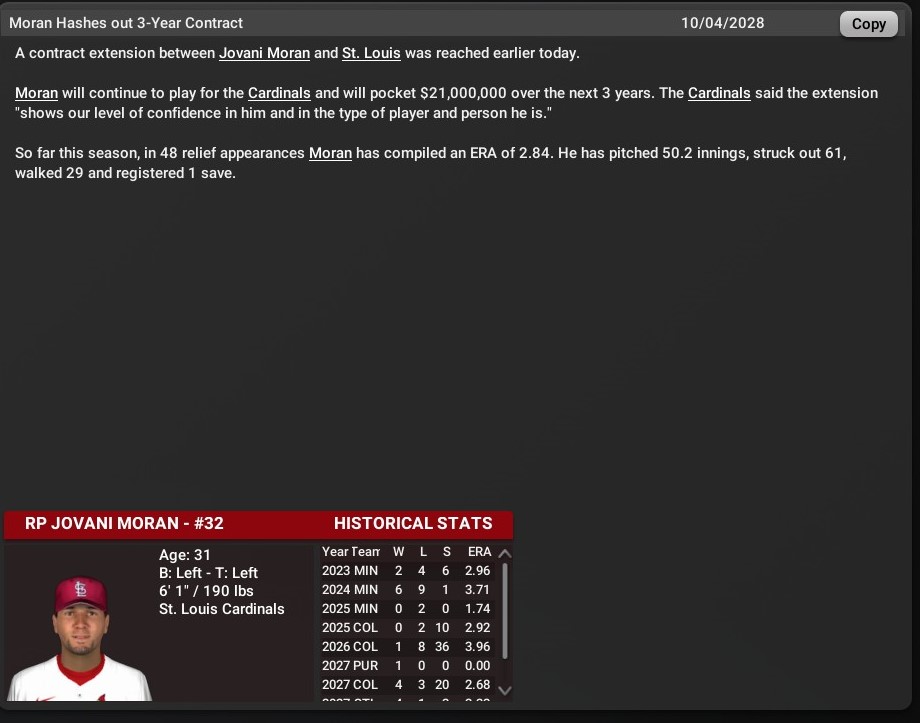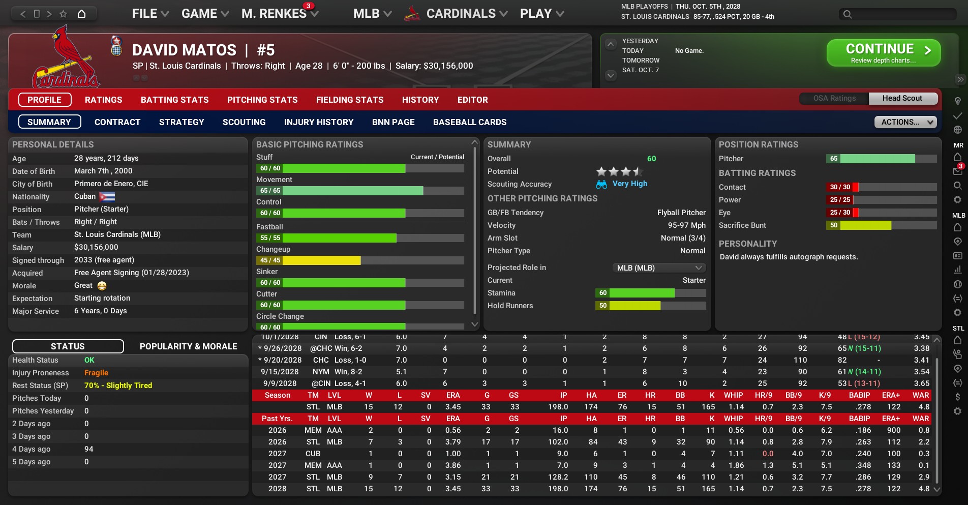 Signed as a free agent out of Cuba in January 2023, reached the majors that same season going 12-11 with a 4.55 ERA in 29 starts. Since that time, the now 28-year-old has comprised a 64-53 record over 165 starts with a 3.80 ERA. This season, Matos went 19-12 with a 3.45 ERA in 33 starts. Matos had two seasons where he struggled with injuries in 2026 and 2027, but managed to get through the 2028 season without missing a scheduled start. Along with the Orioles' Grayson Rodriguez, Matos was expected to be one of the top starting pitchers available in free agency this coming offseason. Matos made $30.156M in 2028. He will making $182,800,000 over the five seasons of his new deal -- $36.56M over the course of his contract, the highest in the major -- with player options on the 2023 and 2033 season. The loss of former Cy Young winner Tink Hence to a career-ending elbow injury led to the urgency to re-sign Matos. He is expected to combine with Dylan Cease and Matt Allen to give St. Louis one of baseball's best top of the rotations in baseball. |