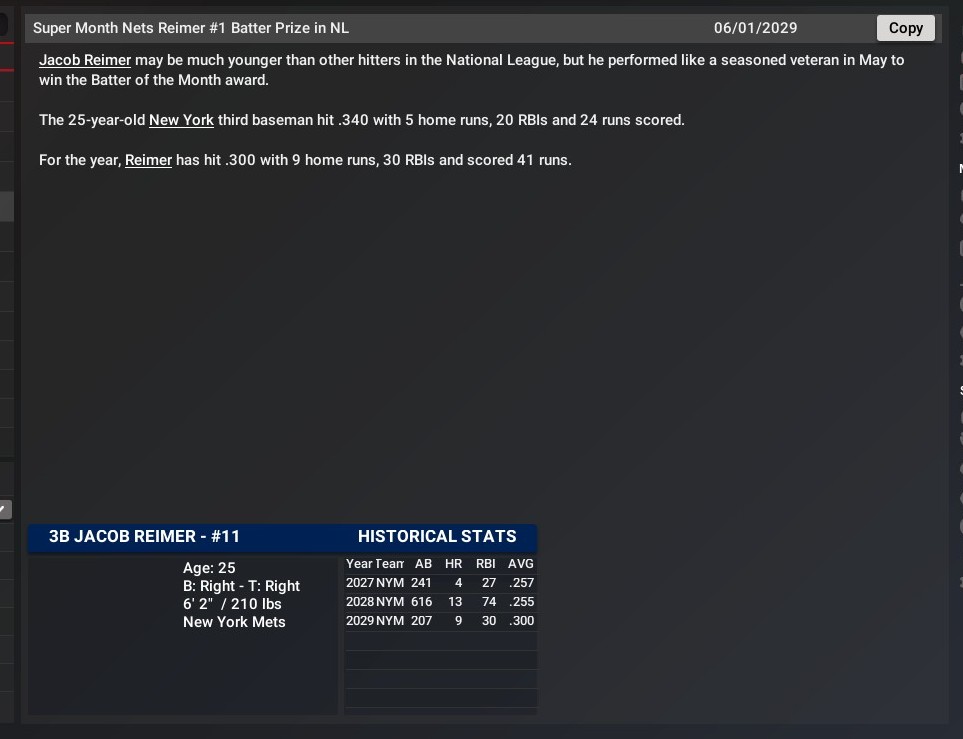 Starting Pitcher of the Month: Zach Showalter -- The 25-year-old right-hander went 2-1 in six starts with a 3.74 ERA. He worked a total of 33.2 innings, during which he struck out 25 and had a 1.26 WHIP. Relief Pitcher of the Month: Dylan Lee -- The 33-year-old left-hander got into seven games going 1-0 with three saves and a 1.04 ERA. He pitched 8.2 innings, during which he struck out seven and had a 0.81 WHIP. |