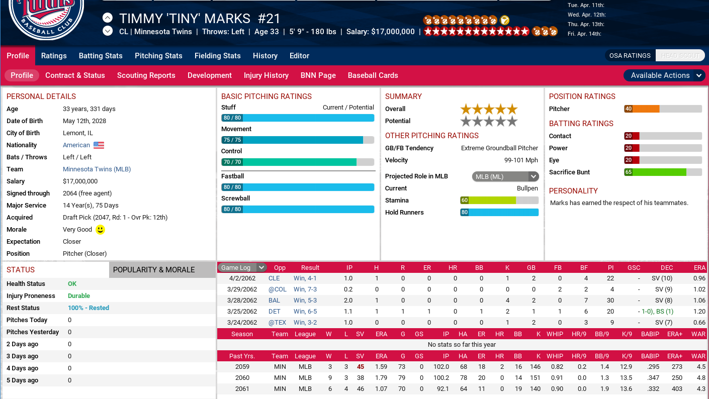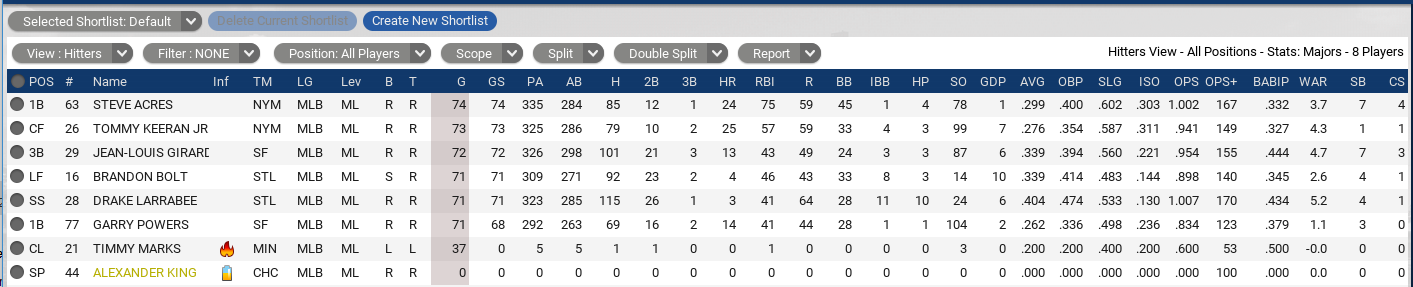 Powers only got one, so I will go day by day watching to see if he gets another, otherwise, he signs with SFG again. Girard: ATL 6@29.18 175.1 PIT 6@24.0 144.0 SFG 6@30.1 180.9 STL 6@25.1 151.0 Powers: SFG 2@19.4 38.8 |