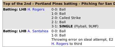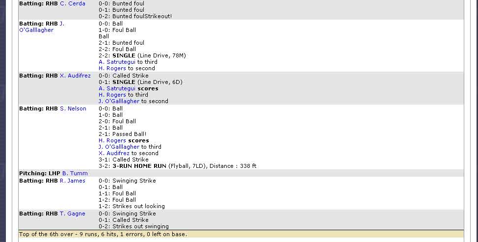 The first is that whenever there is a error in the outfield made by an infielder the batter ends up on 2nd, the batter is credited with a hit and the fielder an error for letting the batter get to 2nd base. The log totals for the half inning will show a hit as well as the box score and player totals, but here is what the log will show: Batting: RHB J. Sandoral 0-0: Ball 1-0: Ball 2-0: SINGLE (Line Drive, 6M) Batting: RHB C. Terry 0-0: Called Strike 0-1: SINGLE (Line Drive, 56D) J. Sandoral to second Batting: RHB B. Kerridge 0-0: Called Strike J. Sandoral steals 3rd base 0-1: Ball 1-1: Foul Ball 1-2: Ball 2-2: Ball 3-2: Fly out, F9 (Flyball, 89M) Runner from 3rd tags up, SCORES, no throw Batting: RHB J. Hiatt 0-0: Called Strike Error in OF, E4 C. Terry to third Batting: RHB T. Ezpinoza 0-0: Ball 1-0: Swinging Strike 1-1: Foul Ball 1-2: Ball 2-2: Ball 3-2: DOUBLE (Flyball, 78XD) C. Terry scores J. Hiatt scores Batting: RHB V. Serenil 0-0: Ball 1-0: SINGLE (Groundball, 56D) T. Ezpinoza to third Batting: RHB A. Machin 0-0: Bunted foul 0-1: Sac Bunt - play at first, batter safe! V. Serenil to second Batting: LHB G. Miner 0-0: Called Strike 0-1: Ball 1-1: Fielders Choice at 2nd, 4-6 (Groundball, 4) T. Ezpinoza scores V. Serenil to third Pinch Hitting: RHB R. Kunz 0-0: Called Strike 0-1: Ball 1-1: Ball 2-1: Foul Ball 2-2: Foul Ball 2-2: Fly out, F7 (Line Drive, 7S). Top of the 5th over - 4 runs, 6 hits, 1 errors, 2 left on base. As you can see 6 hits reported in the totals but there are only 4 hits in log. You get one for the outfield error and the 2nd hit not showing is the sac bunt where the batter gets to 1st base. The sac bunt is being scored correctly as a hit the log is just showing incomplete info. This last is a scoring error as far as I can make out. Batting: LHB B. Gully 0-0: Foul Ball 0-1: Foul Ball 0-2: Ball 1-2: SINGLE (Groundball, 34) N. Sturdivant to third Runner from 3rd tries for Home, throw and OUT! This play was scored as a 4-2 putout. Unfortunately I don't have the pbp but I am remember the hit going to the right fielder which should make it a 9-4-2 assuming the right fielder hit the cutoff man or 9-2 if not. |