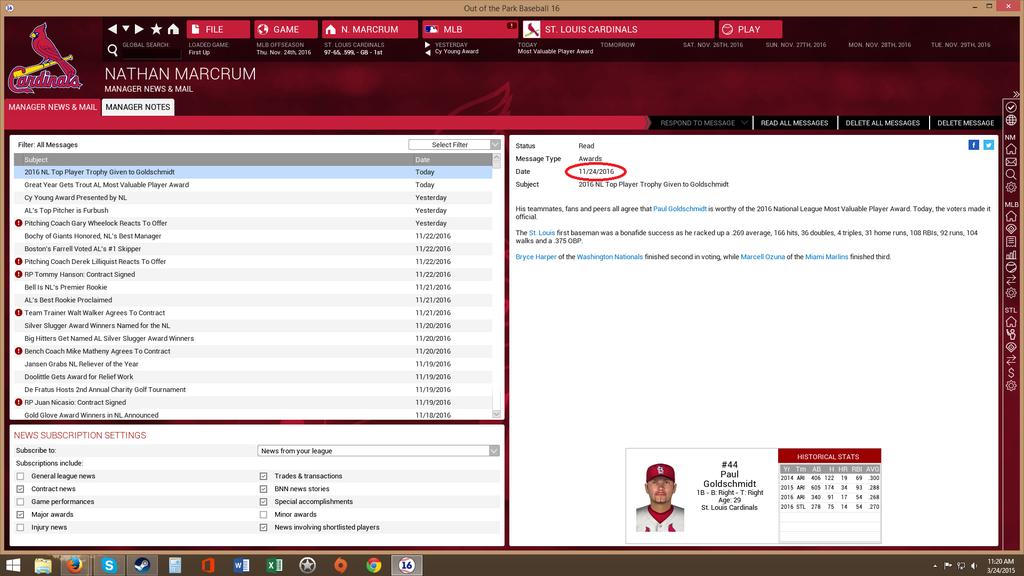 So in my second season with OOTP 16, my owner told me to go out and acquire an MVP award winner. Just want to throw it out there that it is tough to pull this task off. Everybody who has already won one is either on the steep decline and/or has an insane contract that I can't afford to take on. So around the deadline, I went out and got Paul Goldschmidt because my lineup needed a lot of help. At the end of the year, here's what my owner told me: