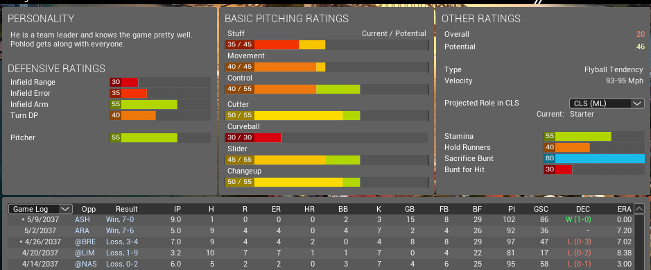 Got in a pinch early season with, of course, unanticipated injuries. Went to AAA and took some time to review SP there; ultimately, on an intuitive whim I selected Mr. Pohlod, a 21-yr-old from North Carolina, coincidentally, to face last year's defending champions Asheville, NC.