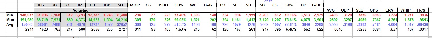 the instuctions work sheet and various comments should help a bit, but there is a steep learning curve to honing these LTM to the stat range you want. here's what i got using it with a 28team, 156 game league ((28/30)(156/162) ~.8988 if you want to divide by that to see a 30t/162g value). *the avg/obp is not a range, it is a difference between the two. it shows min/max and average. there is a missing column because it is the difference of gdp and dp. i didn't do the difference per year in the data table, so no min/max on LiDP - which may not constitute all of dp-gidp. my goal for the the minimum ERA was a bit higher, but don't get picky when you get close to your goals. i'm happy with the total range of ERA. a few ticks one way or the other is no big deal. e.g. there was nothign i could do with balks.. the average was either 90-100 or 165-170 and nothing in between. if you choose to improve it, share with the forums. you can even say it's yours. it even shows a suggestion on the last worksheet how to automate a proper LTM Mod suggestion +/-.500(or any change really) ![]() edit: ugh to .zip ext... could we get .ods added to the approved extensions? Last edited by NoOne; 10-02-2015 at 04:12 AM. |