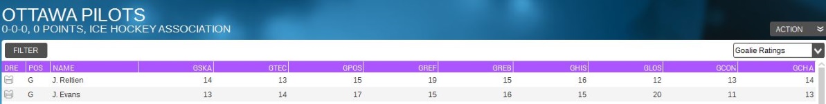 I didn't really know how I should make an extended season preview. For one, I have ran many season tests, and have seen many different results, so I am very apprehensive to even try to make predictions. So the only thing to do is to display the players.... next question: so how to do that? Well, I just decided to post some top players listed by variable ratings but allowing all to see the other ratings to learn more about the talent in the league. The drawback to this method is that you do not actually see the players's teams ... Here we go.... first, goalies