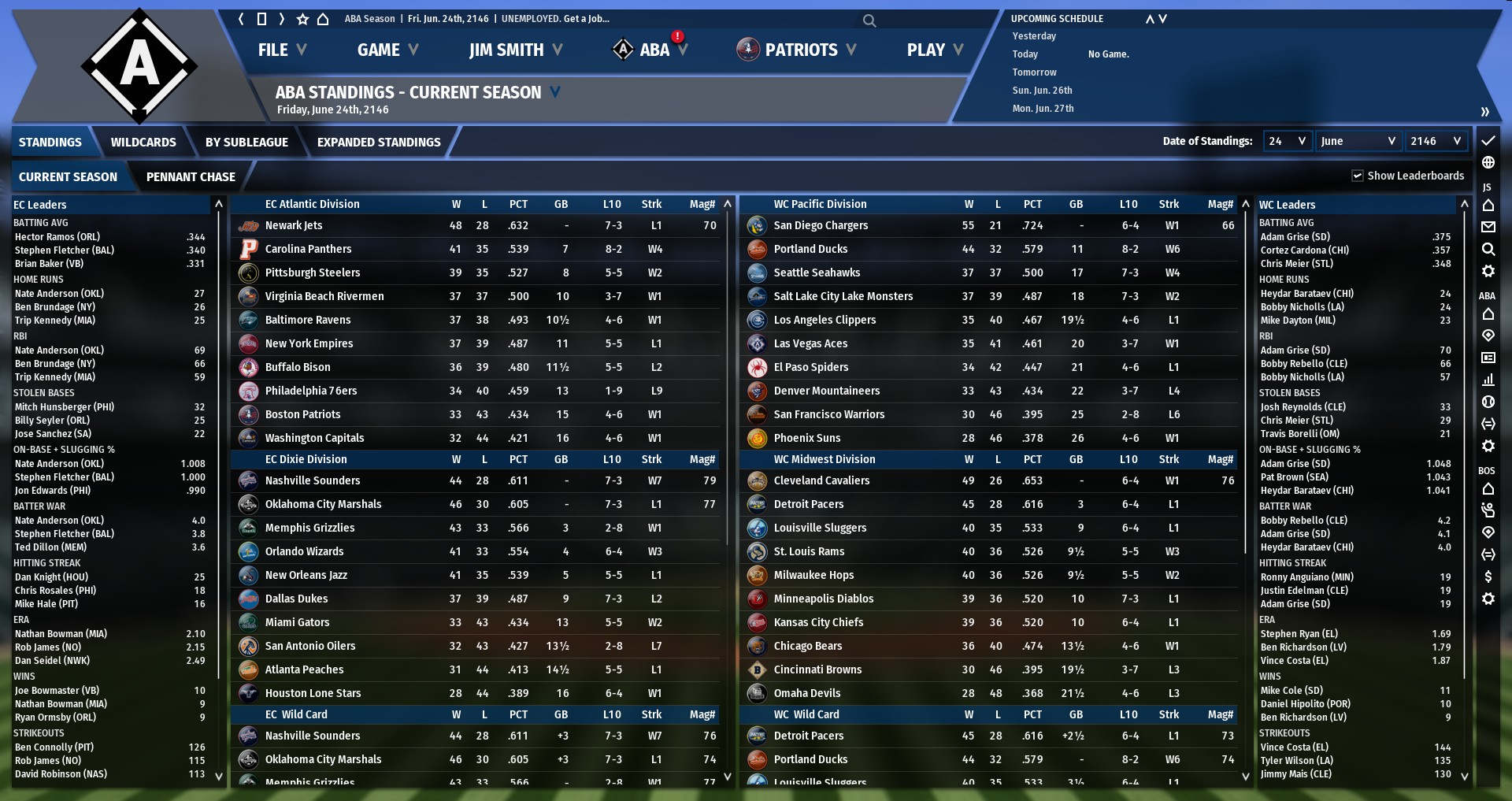 My most recent simulation takes place in the American Baseball League. Currently this league spans from 2017 to 2146. It is a 40 team league based off of 2017 statistics. From each subleague there are four playoff teams, two division winners, and two wildcards.The first photo I am putting up is of the league standings so you can get a view of all the teams. The schedule is balanced and there is no inter league play. This thread does not have true objective. As I post this I have very minimal knowledge of my leagues history. My plan is to just explore the league using tableau, excel, maybe some SAS Enterprise and R; and posting things I find interesting. I'm not too great at data visualization so please bare with me. If there are any questions about something I posted don't hesitate to ask. |