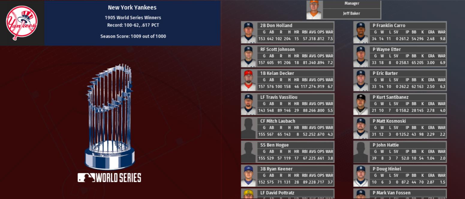 1906 was notable as both Associations had their single-season win records broken.  The defending World Series champion New York Yankees set the National Association mark at 114-48 with an MLB record 454 runs allowed.  Along with another great season from Franklin Carro, the Yankees had the pitcher of year award winner Eric Barter.  Philadelphia again claimed second in the Eastern League, this time finishing 98-64.   In the Midwest League, St. Louis took first at 97-65 on a MVP season by 27-year old centerfielder Jonathon Gillette, whom they signed from Kansas City to an eight-year deal in the offseason. The Louisville Lynx earned the second playoff spot at 94-68. Two years removed from a world title, Milwaukee limped to a 10th place 71-91 mark. However, the Yankees wouldn’t be the winningest team in baseball in 1906. The Phoenix Firebirds set a MLB record at 120-42, a mark untouched in North America in the 20th century, and had an MLB record +371 run differential. Jason Salvage won MVP again and matched his record 52 home run season of a year ago, while teammate Charles Spencer socked 50 dingers. Phoenix pitcher Matt Perry had his career defining season as POTY, although historians note a forgotten gem of a season by 22-year old Mike Longoria of Miami. Longoria almost quietly earned 10.9 WAR for the Mallards, which remains one of the very few 10+ seasons by an MLB pitcher. Many thought he was on the way to an all-time great career, but a torn flexor in 1908 with Miami and a torn UCL in spring training of 1911 with Cincinnati sadly ended that dream. The Denver Dragons had a stellar season in the Western League dwarfed by Phoenix, taking second at 107-55. In the Southern League, defending American Association champion Houston placed first at 94-68. The Memphis Mountain Cats took the second playoff spot at 87-75, one game ahead of Dallas and Miami. The Firebirds rolled Memphis in the first round 3-0 and the Hornets used home-field advantage to sweep Denver, setting up an AACS rematch. This time it went seven, but Houston stunned Phoenix, ending the record-setting year in disappointment and pushing the Hornets to back-to-back Association crowns. New York’s record setting year also saw a disappointing end as instead of back-to-back titles, they were upset 3-2 in the first round by Louisville. Philadelphia topped St. Louis in five, sending both second-place finishers to the NACS. Surprisingly, the Lynx swept the Cardinals to advance to the World Series. For the third straight season, the World Series went seven games. Louisville would defeat Houston, making the Hornets runner-up for the second straight year. After dropping the first WS, the National Association had won five straight over the American Association, a surprising historical lead considering the AA’s to come World Series dominance. 1906 full stats here. |