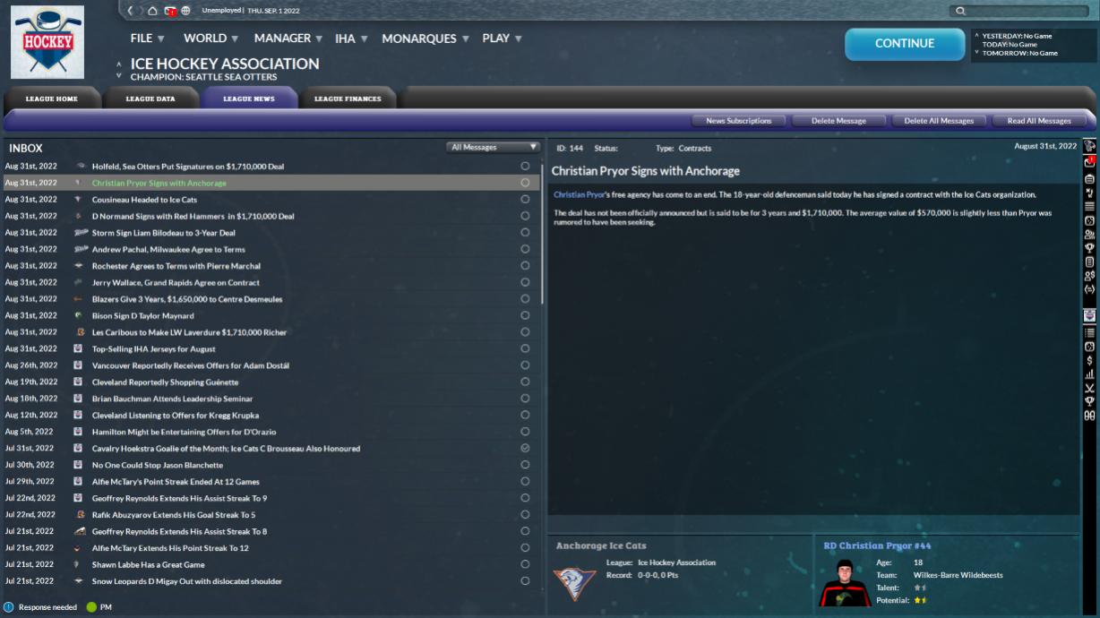 ... The news does advance correctly, but when the game is relaunched, the original relevant player is shown in the bottom, but the news is all different and concering other players .. The playoffs disappeared for the main league it often freezes when advancing