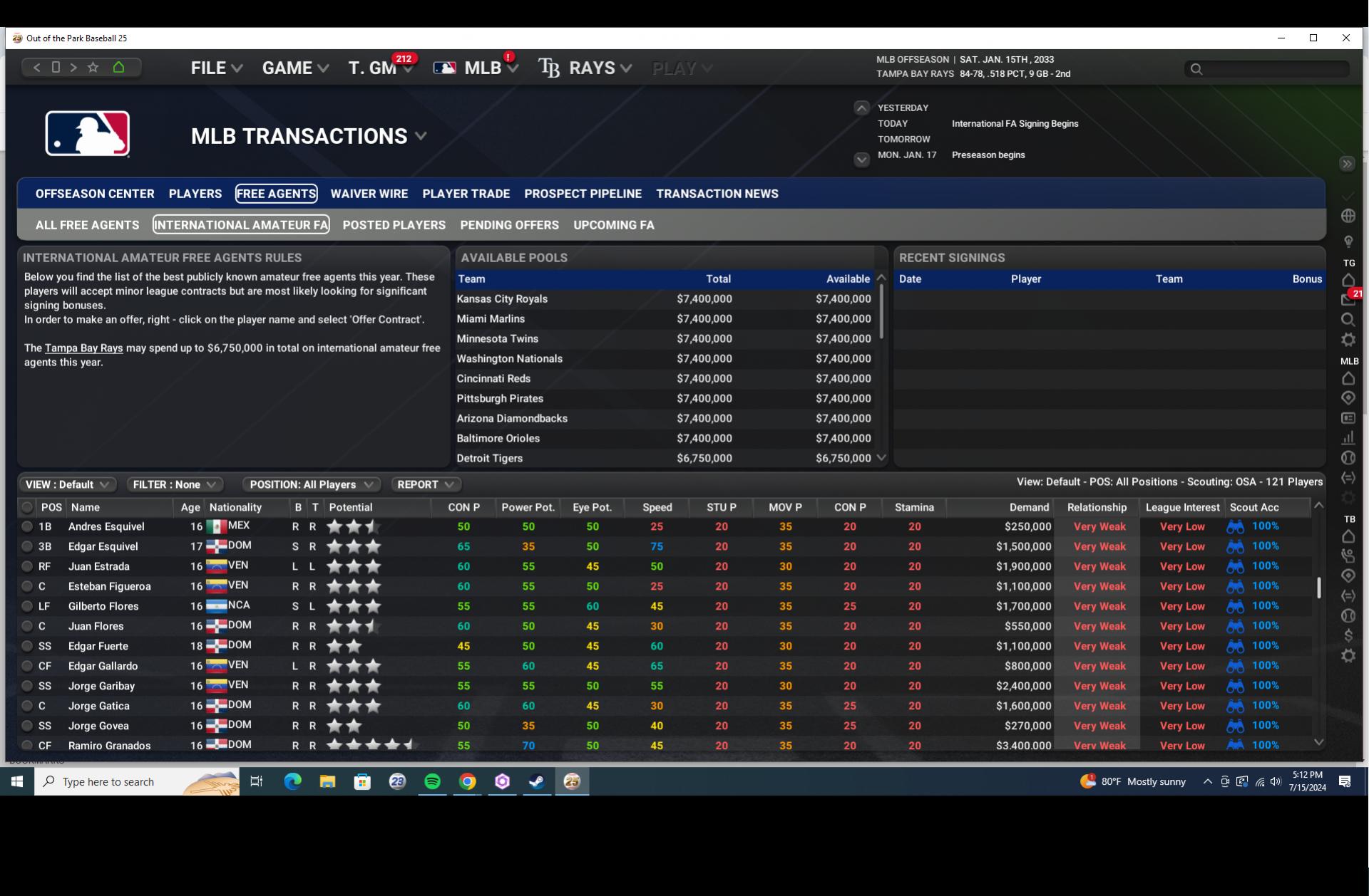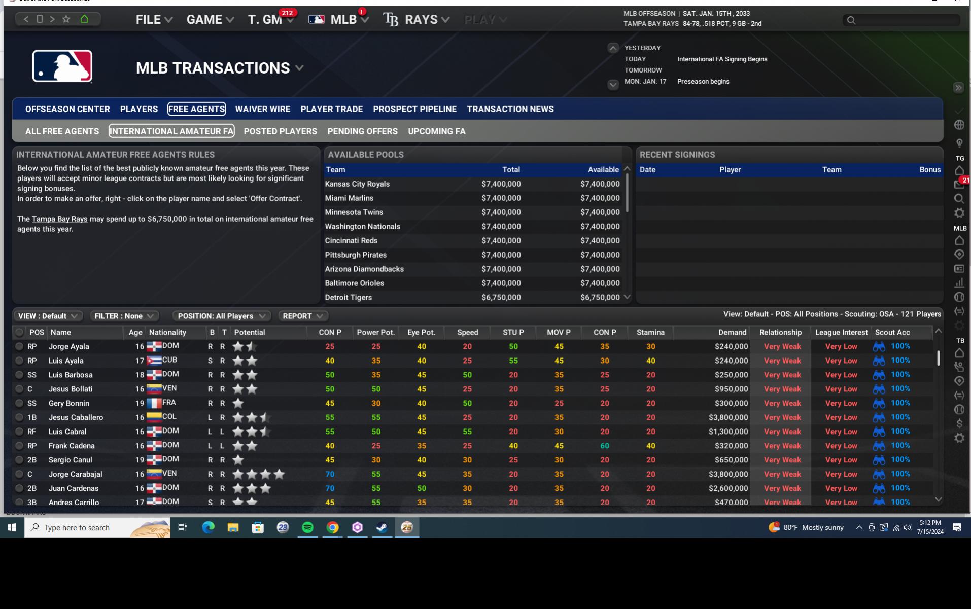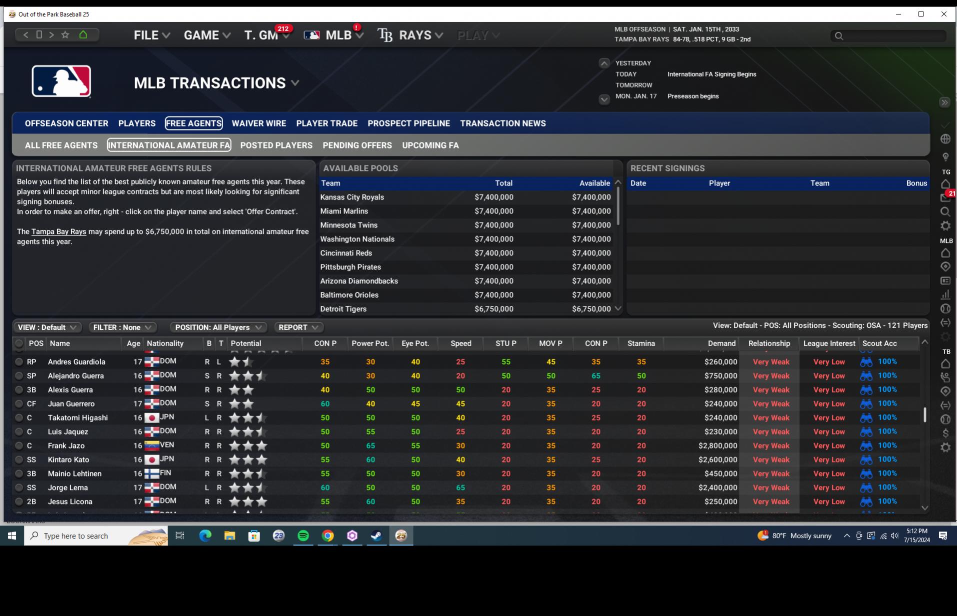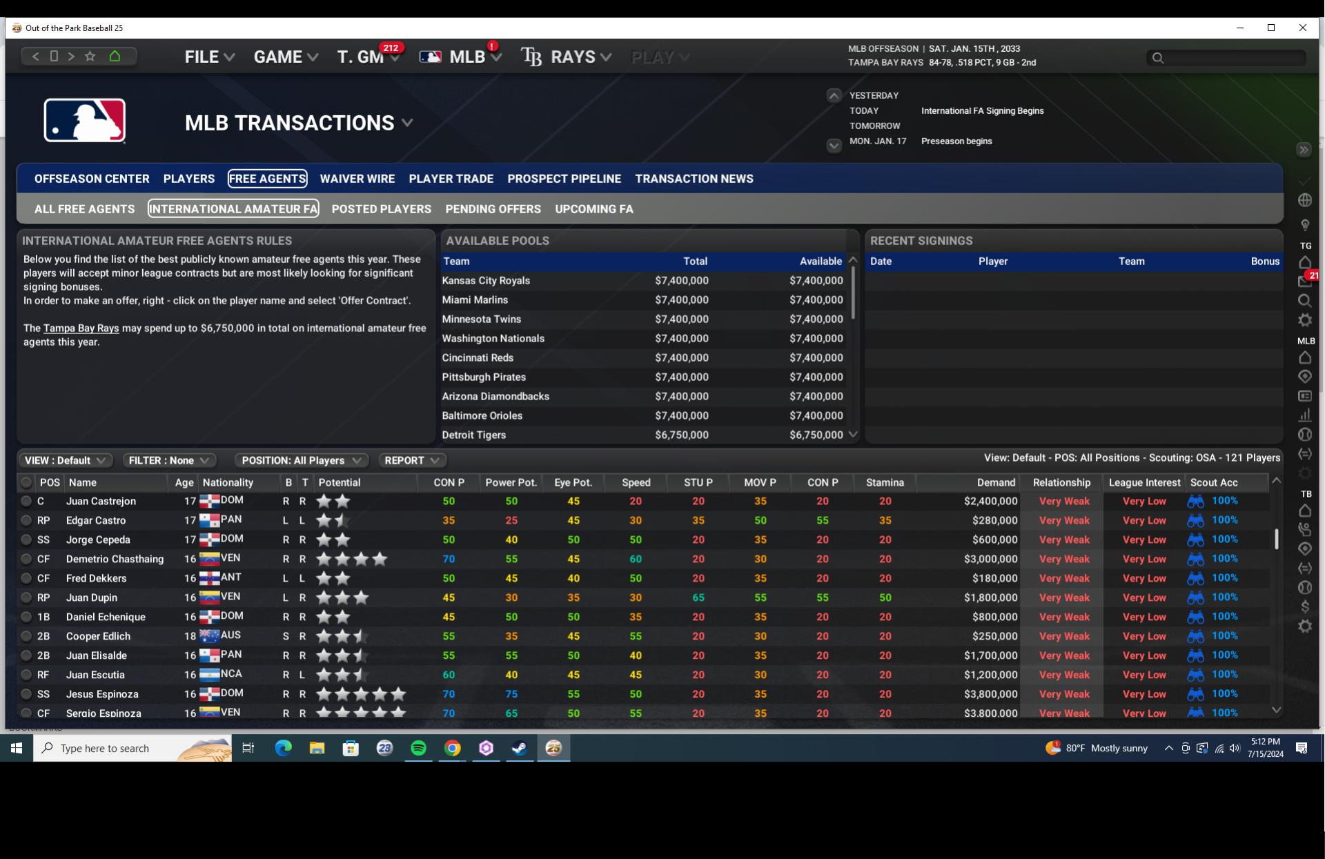 Every single one of the International Free agents is showing up as having "very weak" interest in signing with my team. In game date is 1/15/33.