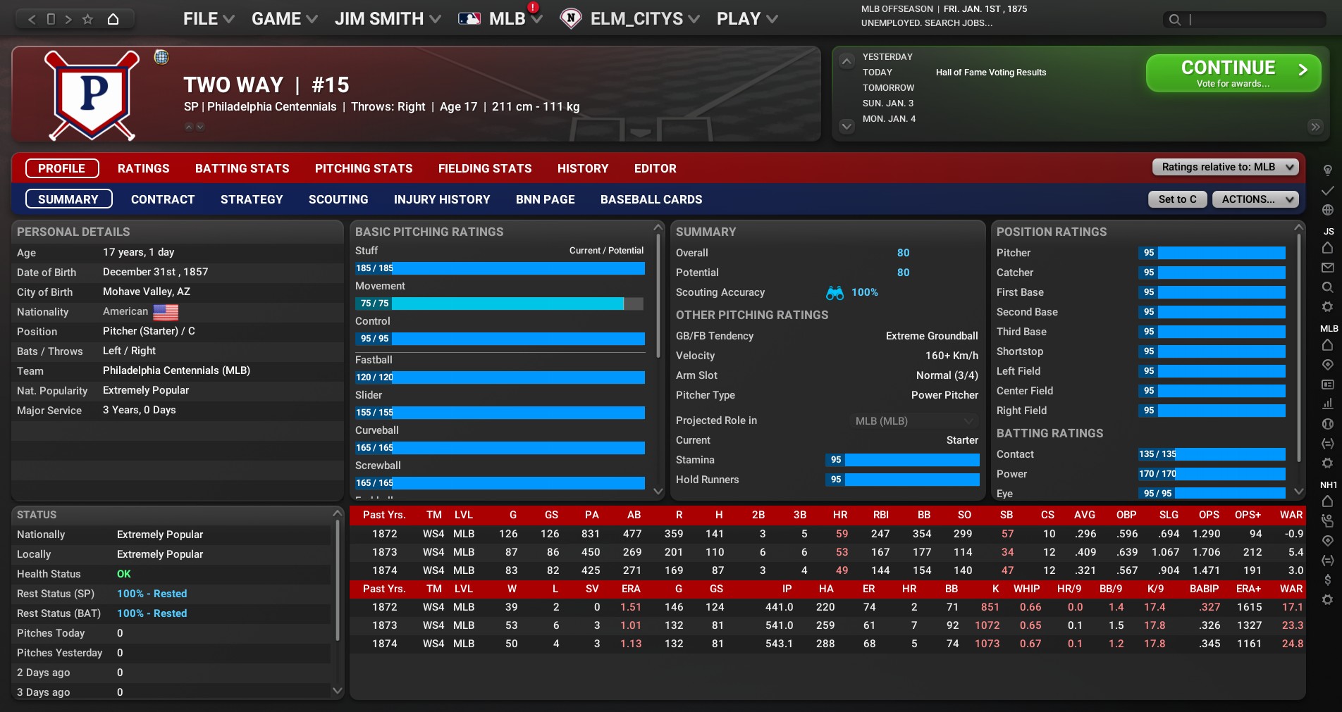 (Enable Injuries, Enable Suspensions unchecked, overpowered player creation, 162 Games, 1 Man Rotation, reset the Position Player Fatigue to None annually, etc) As you can see, we pitch and hit regardless of the number of days needed to recover between starts. This indicates that pitcher fatigue is not being adequately factored into pitching and hitting performance. Last edited by ayconda; 07-26-2024 at 10:58 PM. |