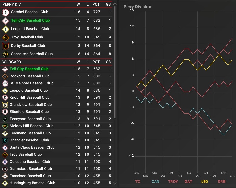 August 9, 1871: After yesterday’s crazy affair, today was something of a letdown, as Holland didn’t match our energy ... I’m fine with it, as we built a 3-0 lead in the first half and then were able to cruise to victory. A three-run inning in the bottom of the seventh simply sealed the deal, as we won easily 6-0. Bjornson is now 25-9 with a 1.85 ERA, and he only allowed three hits all day, walking two. We had ten hits ourselves, led by Musselman who had three hits and two runs while stealing a pair, bringing his total on the year to 81. August 10, 1871: We’re on the road to play Celestine (28-44) next, and we swept them in our two home games earlier in the season. We took the lead 1-0 in the top of the fourth, but Celestine fought back hard in the sixth, tying it with a line drive single by their left fielder Jamie Jaco. With two outs they took the lead with a single that drove home two runs, and just like that this one was a serious ballgame. Centeno reached on an error, stole third and scored off an RBI single by Graham in the top of the eighth to get us back in the chase, and we tied it up moments later when Ryan Carl hit a single into center ... Graham tried for third, and thanks to an E8 error, he wound up scoring all the way from first off that hit! But Cadenhead gave them two more runs in the bottom of the inning, so we had our work cut out for us in the top of the ninth. Steve Hopkins pinch-hit for Cadenhead, singling into center, and though Musselman hit into a fielder’s choice, he then stole second and third to get into scoring position ... but it was too little, too late. He stayed there at third and we lost this one in a 5-3 heartbreaker. The loss was Cadenhead’s 10th, allowing eight hits and five runs, two earned as we matched them with eight hits ourselves. Centeno led the way with two hits and a run, while Musselman had a hit and two steals but was unable to get on the board. August 11, 1871: This game was tight early, as we traded runs in the third, fourth and fifth, clinging to a 2-1 lead heading into the top of the sixth. But that’s when we took control for good -- an RBI single by Bjornson and a sac-fly by Ismael Chinea extended our lead, and we added insurance runs in the eighth and ninth to seal a dominating 6-1 win. Bjornson pitched a five-hit game, striking out two and allowing just the one earned run as he continues to impress on the mound. We outhit them 10-5 behind two hits, a run and three RBIs from Chinea and two hits, two runs and two stolen bases via Musselman. He’s literally “running away” with the stolen bases race this season, leading his nearest compatriot by 31 steals. He’s setting the standard, and has made himself a frontrunner in the MVP conversations with a good chunk of the season remaining to be played. August 12, 1871: Troy’s up next in our season, bringing their 43-31 record onto our field as they and Gatchel both are locked into the wildcard conversations -- only two teams get into the playoffs as wildcards, and both may well come from our division even as we now sit six games up on the rest of our divisional competitors. We swept them on their field in May, so they’re hungry for revenge, and they got out to a quick 2-0 lead in the top of the first. But Musselman got a hit, a steal and scored off a single by Centeno in the bottom of the inning, so we weren’t taking them lightly. With the bases loaded a few minutes later, thanks to Graham taking a hit to the shoulder, we had a chance to blow it open but Ryan Carl popped out to second, ending the frame. We got three runs off in the bottom of the third to take a 4-3 lead, however, and we took control from there, shutting them down efficiently as we won 7-3. Cadenhead only gave them six hits and three runs (two earned) with a pair of walks and a strikeout, and we put up 14 hits to keep them cowed. Centeno led the way with three hits, a run and three RBIs, and Musselman had two hits, a run and the one steal he picked up in the first inning. August 13, 1871: Troy beat us out 2-1 in the first inning, same as yesterday, but we tied it in the bottom of the second and held a 5-2 lead after three. They never got closer, though they at least tried to keep us honest ... we just had too much offensive firepower for them to stop us. We went on to win 6-3, completing the season sweep! Bjornson improved to 27-9 with a 1.78 ERA, allowing eight hits with two strikeouts and three unearned runs. They actually outhit us 8-7, but they also committed nine errors to our four, which killed any comeback chances. Bjornson actually led our offense as well, with two hits and a run, bringing his average up to .226 through his 38th start. August 14, 1871: We led early 2-0 midway through the second in our first of two games against Santa Claus (36-40) on their field, but we picked up a run at a time in the third, fourth and sixth to take control of this one. They might have stood a chance still, these games can turn on a dime, but we put up five runs in the top of the ninth to completely gut them, winning this one 10-1 as we outslugged them 14-5. Cadenhead got through the game with five hits, a walk, a strikeout and the one (unearned) run, improving his record to 23-10, and Chinea led the offense with four hits and three RBIs! August 15, 1871: This was a close game for six innings, and we trailed them 1-0 until Chinea hit his 13th homer of the year, a solo shot that tied us up midway through the sixth. But we HAMMERED them in the top of the seventh for nine runs, turning a tight battle into a comical rout in a matter of 13 batters in a single inning, and for the second game in a row we beat them by a 10-1 margin. Bjornson only let them have six hits and the one earned run, and we only outhit them 12-6, though five of those were doubles, triples or homers. Musselman had four hits, two runs and an RBI with two stolen bases early in the game, and Chinea added two hits, two runs and four RBIs batting be