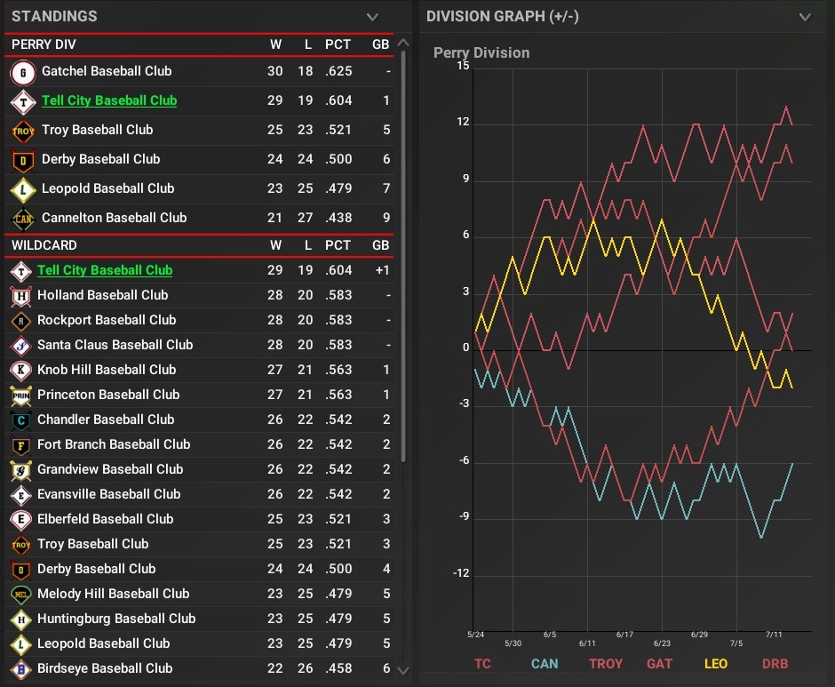 Today we were able to keep it close early, tied 1-1 through the third inning, but Boonville scored runs in the fourth and fifth to build a lead. Alex Centeno hit a two-run homer in the bottom of the sixth to tie it up, his 18th homer this year, but we couldn’t get over the hump and this one went into extra innings. With two outs in the top of the 10th, Glen Cadenhead gave up a fastball to the wrong hitter and Boonville retook the lead 4-3 thanks to a screaming double down the right field line ... that was all it took for them to beat us by a run and extend our losing streak to three in a row. Cadenhead took his 13th loss, falling to 28-13 with a 2.30 ERA, allowing 11 hits and four runs (one earned) as we got outhit 11-7. Centeno led the way with two hits, a run and an RBI as he maintained his .322 average. September 2, 1871: We let out a lot of pent-up aggression today against Booneville, building on a 1-0 lead in the sixth to add on nine runs in the bottoms of the sixth and seventh. They never had a chance after that, as we won easily 10-1. Bjornson improved to 34-10, pitching a three-hitter with just the one unearned run, and we outhit Boonville 13-3. Chinea led the way with three hits, a run and four RBIs, and Centeno hit his 19th homer, finishing with a hit, two walks, a run and two RBIs. September 3, 1871: We’re on the road in Lynnville (44-50) today for the first of two, and the game was a tightly fought one until the top of the ninth. We went into that inning leading 4-3 and needing some insurance, and we bought a whole slate of it with five runs in the top half of the inning ... they never had a chance after that as we closed the door on them 9-3. Cadenhead got the win, his 29th, allowing five hits and three unearned runs, and we outhit them 10-5, led by Steve Williamson with two hits and two runs scored. September 4, 1871: This time we dominated from the jump, building a 6-0 lead heading into the bottom of the ninth inning ... but Bjornson had a rough frame, giving up four unanswered runs, and with two outs and runners on second and third we had no choice but to bring out Eric Behmer to douse the flames. Unfortunately he walked a runner to load the bases, and a rolling single into center drove in a pair to tie the score. But he got us into extras, at least, so we had a chance. Or really, we didn’t ... you blow a six-run lead on the road in this league and you’re tempting lightning to strike you. Lynnwood won the game on a passed ball, taking this one 7-6 as we snatched defeat from the jaws of victory. We outhit them 10-8 but committed five errors including a critical one in the 10th in the outfield, and though Behmer took the loss (0-1, 5.09 ERA), all six runs in the ninth belonged to Bjornson, and they were ALL earned. Danny Graham led the offense with two hits, two runs and two RBIs. September 5, 1871: Princeton’s in town for a pair, and they bring their 58-38 record with them, as we stumble around at 66-30 having lost four of our last six games, on the verge of losing the top spot in the league’s power rankings as we try to regain our footing. Princeton led 2-0 after six innings, but we gained three runs in the bottom of the sixth to get our first lead of the game. We were knotted 4-4 heading into the bottom of the ninth, but Alex Centeno powered us through with a three-run walkoff homer to win the game, his 21st of the season as he’s been RED HOT lately. Cadenhead improved to 30-13 with a 2.27 ERA, allowing eight hits, three walks and four runs (three earned) as we held on to win, and we outhit them 10-8, led by three hits and an RBI from Graham and a hit, a walk, two runs and three RBIs for Centeno. September 6, 1871: We traded runs back and forth through the first seven innings, but we broke through with a Centeno two-run homer in the bottom of the eighth ... that’s 22 for him as he continues to dominate the league with his power! That was all we needed to sweep them 5-3, despite being outhit 8-5 and matching them with four errors each. Centeno led with a hit, a run and two RBIs, and Bjornson improved to 35-10 as he stays on pace to be in consideration for the league’s best pitcher award ... he allowed just eight hits, a walk and three runs (two earned) as we improved to 68-30. September 7, 1871: We’re on the road in Fort Branch (55-43) as we have managed to actually increase our lead in the division by a game (now up 11 games on Gatchel’s 57-41 record). We’re hoping to get Musselman back in a few days as long as he clears medical examiniations, and though we’re weeks away from being able to clinch a division win (with three teams still to play in our division aside from all the others we’ll still have to face) we’ve avoided an injury-related collapse so far. Tonight we put on a dominant performance against the road team, scoring three in the second and three in the fifth, coasting to an 8-0 shutout victory! We outhit them 8-3, and the three-hit shutout was Cadenhead’s fifth, with the fewest hits allowed of any of them! Scott Hopkins led our offense with three hits and an RBI, while Steve Williamson added a hit, three runs and two RBIs. September 8, 1871: Tonight we faced a stiffer challenge from Fort Branch, but we still took the lead from them with a two-run double by Chinea in the top of the seventh. That gave us a 3-2 lead we’d carry the rest of the way as we swept them and won our 70th game out of 100 tries. Bjornson pitched a complete game with three hits and two runs, taking just 76 pitches to do it, and we outhit them 6-3, led again by Hopkins with two hits and a run. September 9, 1871: Birdseye (51-49) has come to Tell City for a pair, and we’re still awaiting news about Musselman’s return. We had a solid 4-2 lead going into the top of the eighth, but Birdseye hit us hard with three runs in the top of that inning. We came up to hit in the bottom of the ninth still trailing by a run, but though we got runners into scoring posit