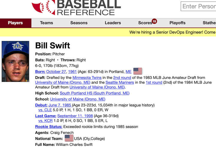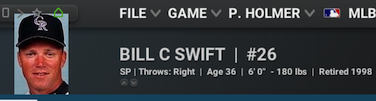 The Bill Swift I was looking for played for 11 years between 1932 and 1943, mainly in the National League. (I'll refer to him as BS1.) He was a journeyman pitcher who maintained what appears to be an average record and ERA. BS1 pitched for Pittsburgh for 8 seasons; he then spent a season the Braves and one with the Dodgers before finishing his career with a year the White Sox. His bio and stats are below. |