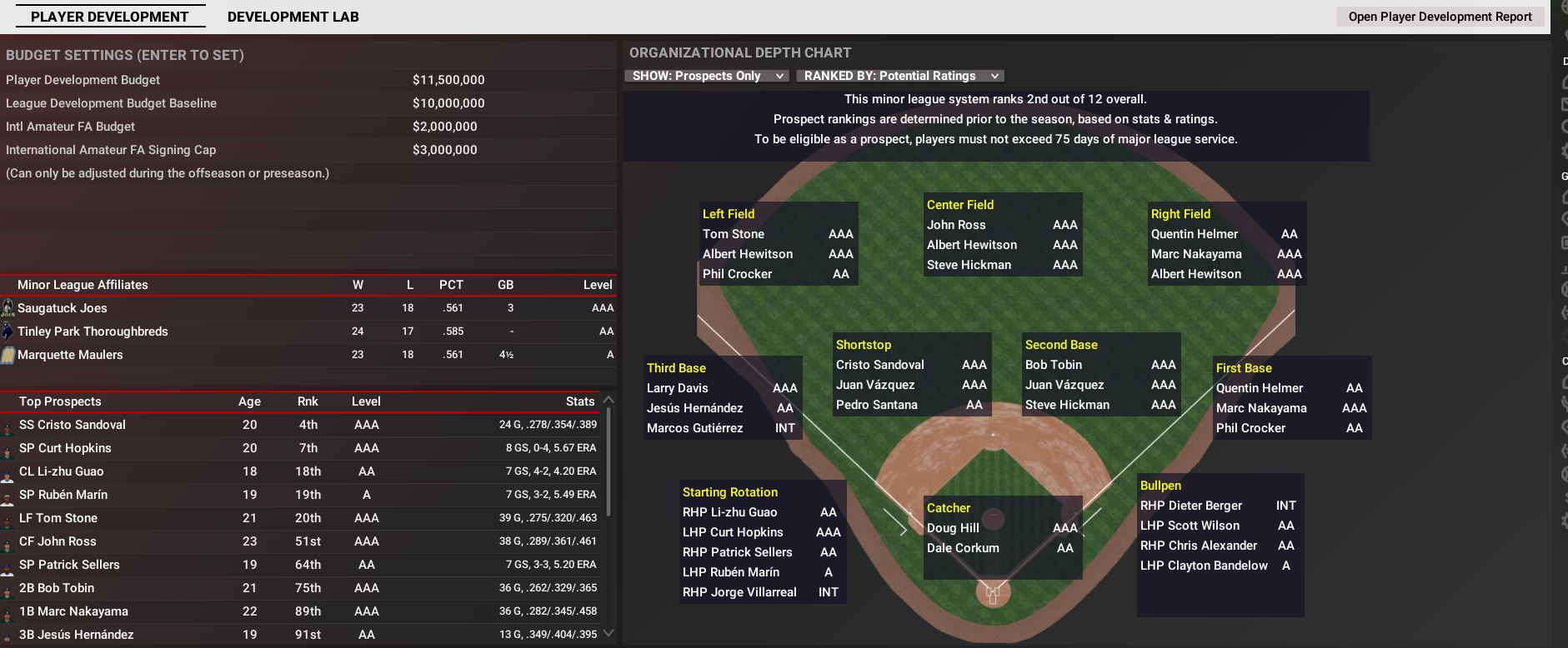 Those players were primarily pitchers. Even though we had shored up our starting rotation from the start of last year where we have up to 6+ guys ready to start. But there was one that really had our interest and that was former Toledo SP lefty Dwayne Miller (30). We were surprised that Toledo had not extended Miller but his results for 2054 with an ERA+ of 94 was not something the budget tight Neptunes could afford. We made a solid offer I thought of 5 years and $66 million, but we underestimated the market. The Detroit T-Birds swooped in and signed Miller to a 4 year $59m total. We had lost our #1 target. We turned our attention quickly to another top quality starter, but not a lefty. SP Val Imbert had pitched for the cellar dwelling (shared) USA club Detroit. Imbert (29) didn’t have a great season going 12-10 with a 4.87 ERA, but he is a team captain type player and we believe with a solid supporting cast behind him, he will revert back to his form several seasons ago. Imbert was signed for a 4-year $39m deal with the 4th season being a team option. We also re-signed RP Bradley Sentner to a 1-year $1.7m dollar deal. Sentner had pitched well after we reviewed things in the off-season and was another team leader. He would be a long man out of the bullpen in 2055. We were looking for a LHRP and they were in short supply. We decided to take a chance and sign 33-year old RP Jerry Powell to a 2-year deal at $1.7m per season. He will take the place of Kade Cason who filled the lefty role adequately but was wanting way too much money. We could probably wait him out, but decided to take Powell while we could get him. Quote: